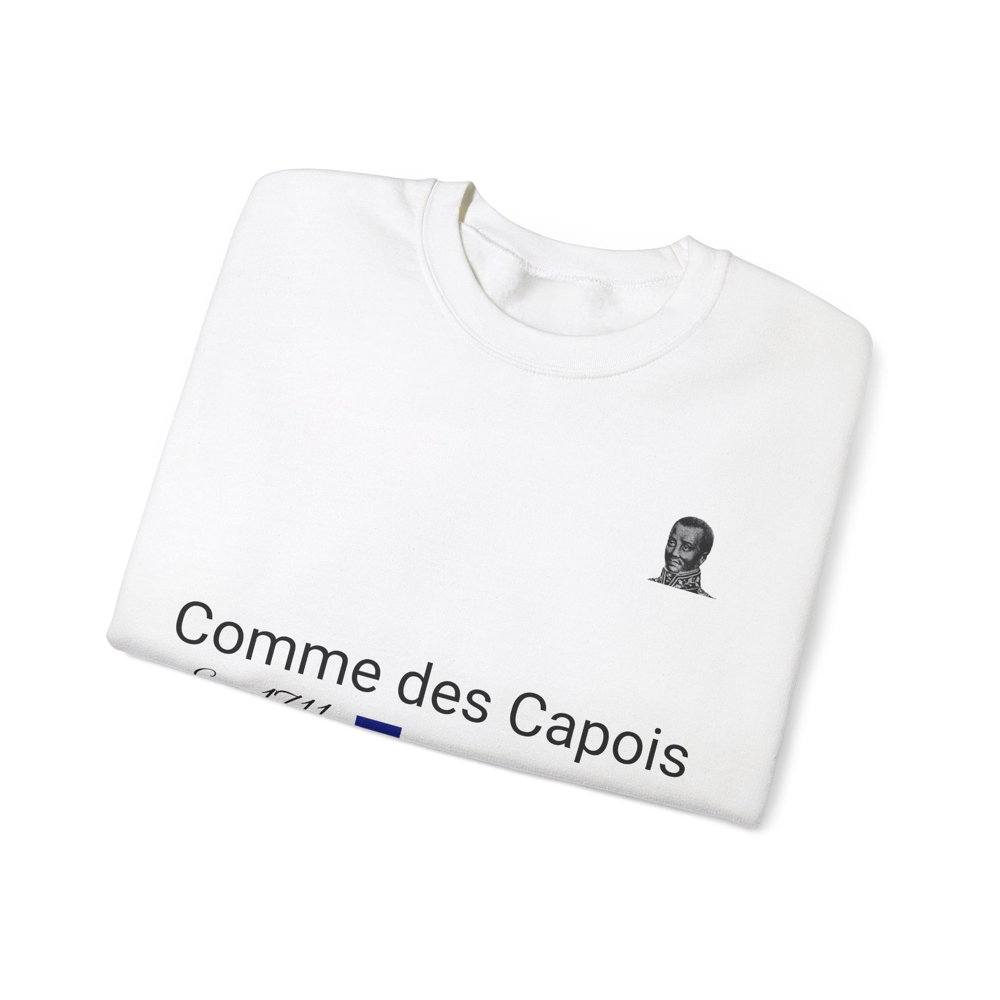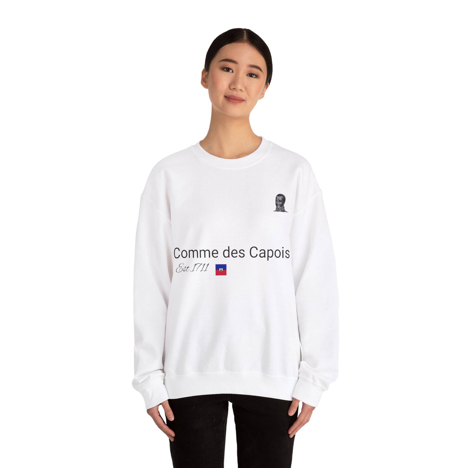 Rep your favorite Haitian city with pride. The Comme Des Capois sweatshirt provides a modern twist and hommage to Haitian revolution key players, this comfy sweatshirt is a great conversation starter and a perfect closet essential.